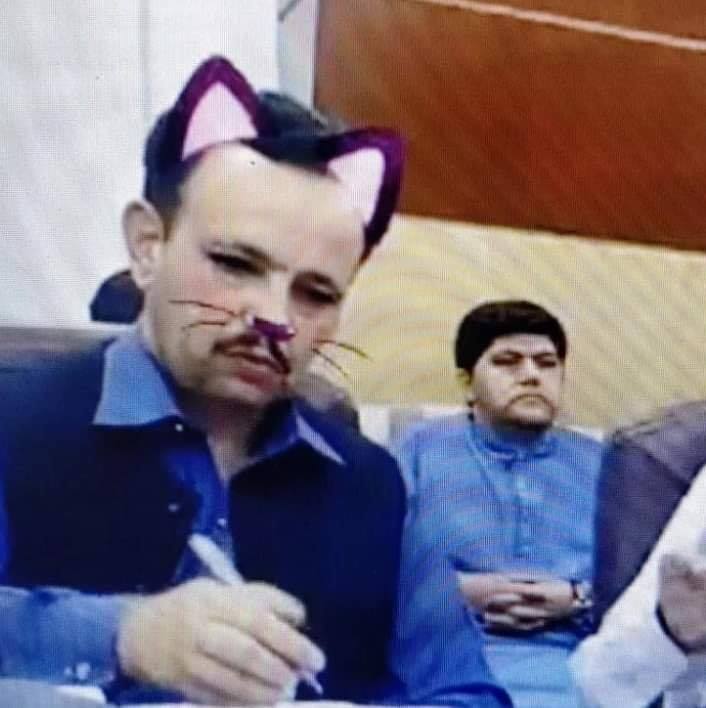 بختونخوا في باكستان، وزملائه من المسؤولين، وعلى وجوههم ورؤوسهم مؤثرات تظهرهم كالقطط.