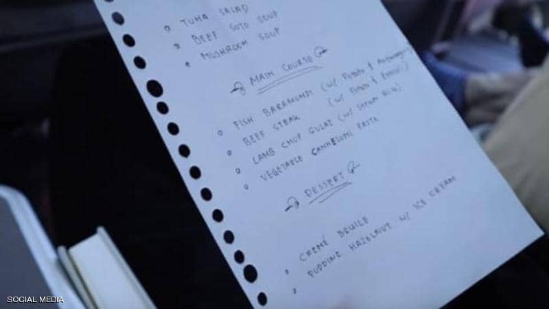 وأورد المصدر، أن صانع المحتوى على الإنترنت ريوس فرنانديس كان على متن درجة رجال الأعمال في الطائرة، وفضح قائمة الطعام المكتوبة بخط اليد من خلال نشرها مرفوقة بعبارة "سيدي، تجري الآن طباعة القائمة".