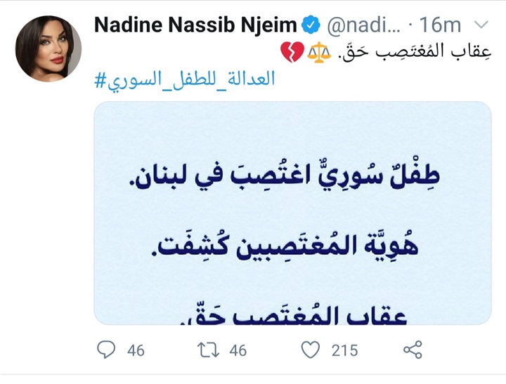 ‏وقالت "نادين" عبر حسابها على موقع التغريدات "تويتر":" عقاب المغتصب حق، العدالة للطفل السوري"