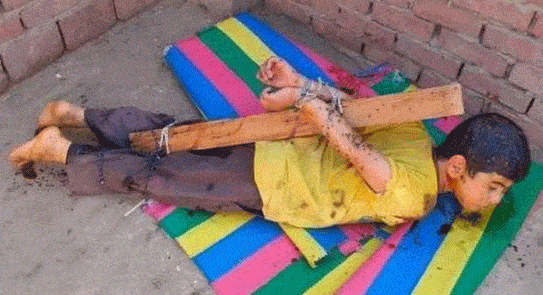 وتداول رواد مواقع التواصل الاجتماعي صورة لأب يقوم بتعذيب طفله بربطه بحبل وخشب وتركه على سطح منزلهما.