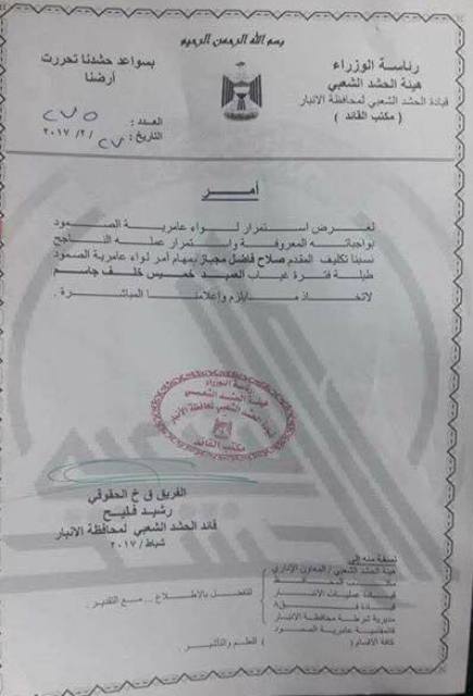 ، اصدر امرا بتكليفي بمهام قيادة حشد عشائر عامرية الصمود في قضاء عامرية الصمود (23كم جنوب الفلوجة)".