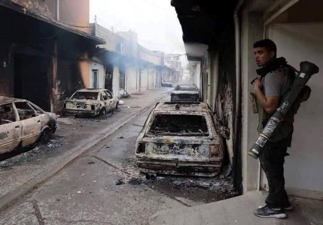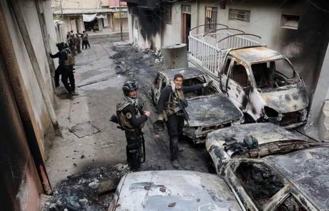 وتناقل ناشطون على مواقع التواصل الاجتماعي الفيسبوك، صور لاحد شوارع منطقة وادي حجر الذي تم تحريره مؤخرا، وتظهر فيها انتشار لافراد قوات مكافحة الارهاب مع عددا من السيارات التي دمرها تنظيم "