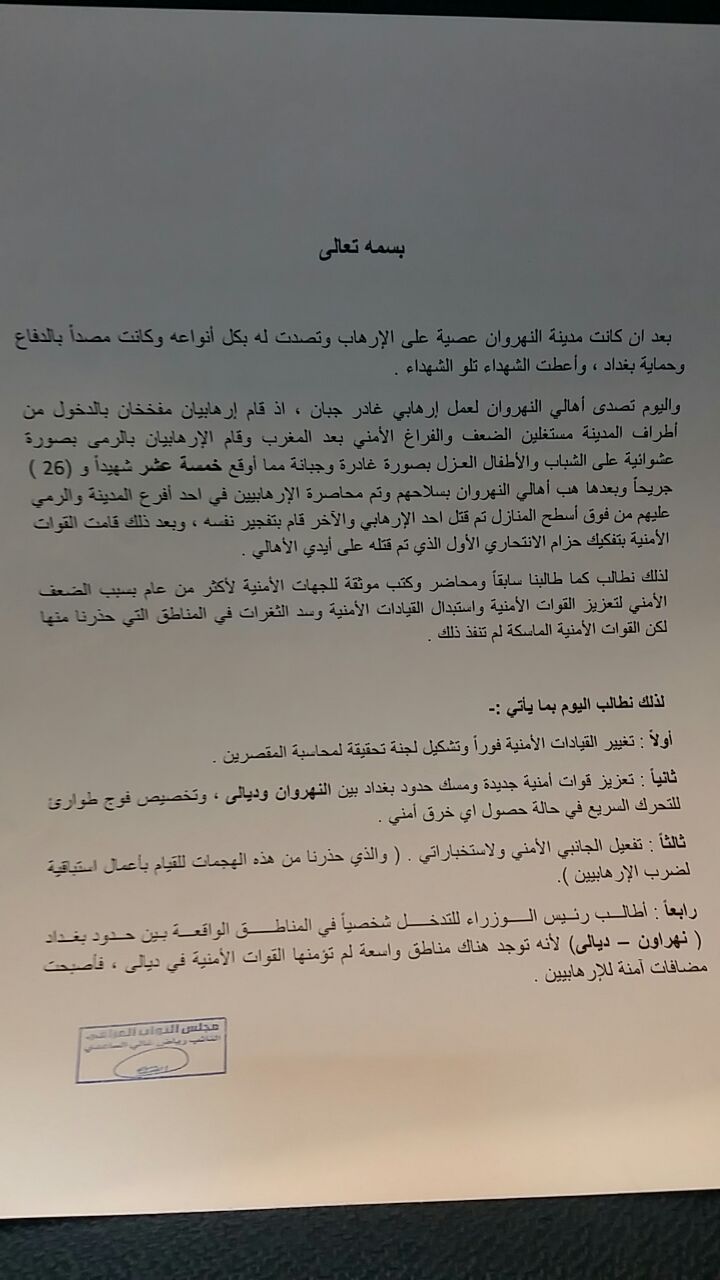 لحماية بغداد واعطت الشهداء تلو الشهداء واخرها تصديها لعمل ارهابي غادر وجبان بعد ان قام ارهابيان مفخخان بدخول اطراف المدينة مستغلين الضعف والفراغ الامني ثم قاما بالرمي عشوائيا على المدنيين الابرياء وذهب ضحيتها 15 شهيدا و26 جريحا، وبعدها هب اهالي النهروان بسلاحهم وتم محاصرتهما في احد افرع المدينة والرمي عليهم من فوق الاسطح حيث قتل احدهما والاخر فجر نفسه".