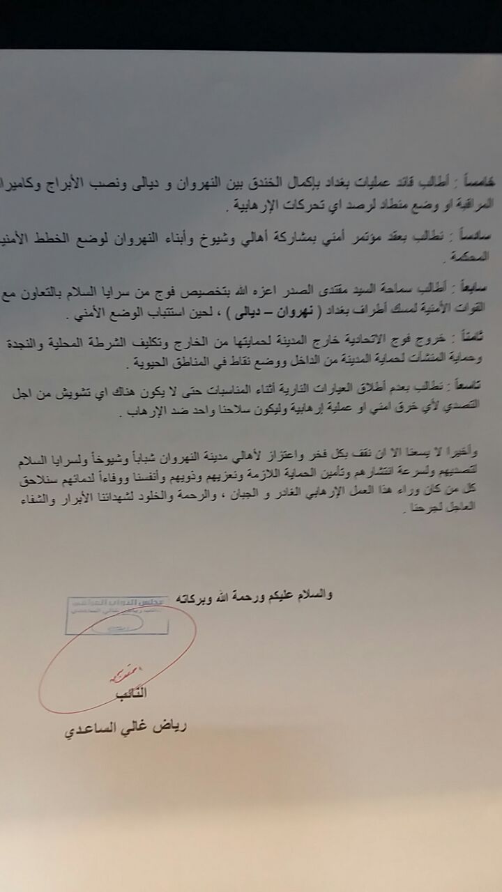 بالوثيقة.. نائب يقدم مطالب الى الامن النيابية بشأن النهروان
