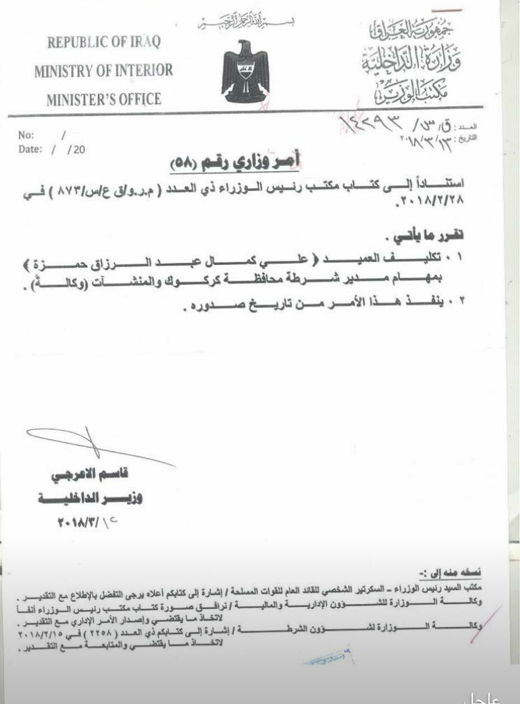 بالوثيقة.. الداخلية تصدر امرا بتكليف قائدا لشرطة كركوك بالوكالة