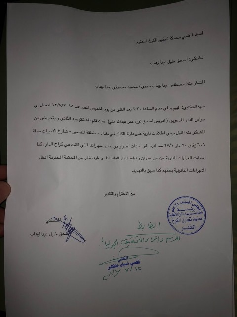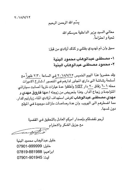 لاجراء تحقيق ورفع دعوى قضائية لالقاء القبض على المنفذ وتحويله الى القضاء لاجراء اللازم"، لافتا الى ان "هذه المحاولة هي الثالثة من قبلهم بعد اتهامي بدعوى كيدية (4 ارهاب)".