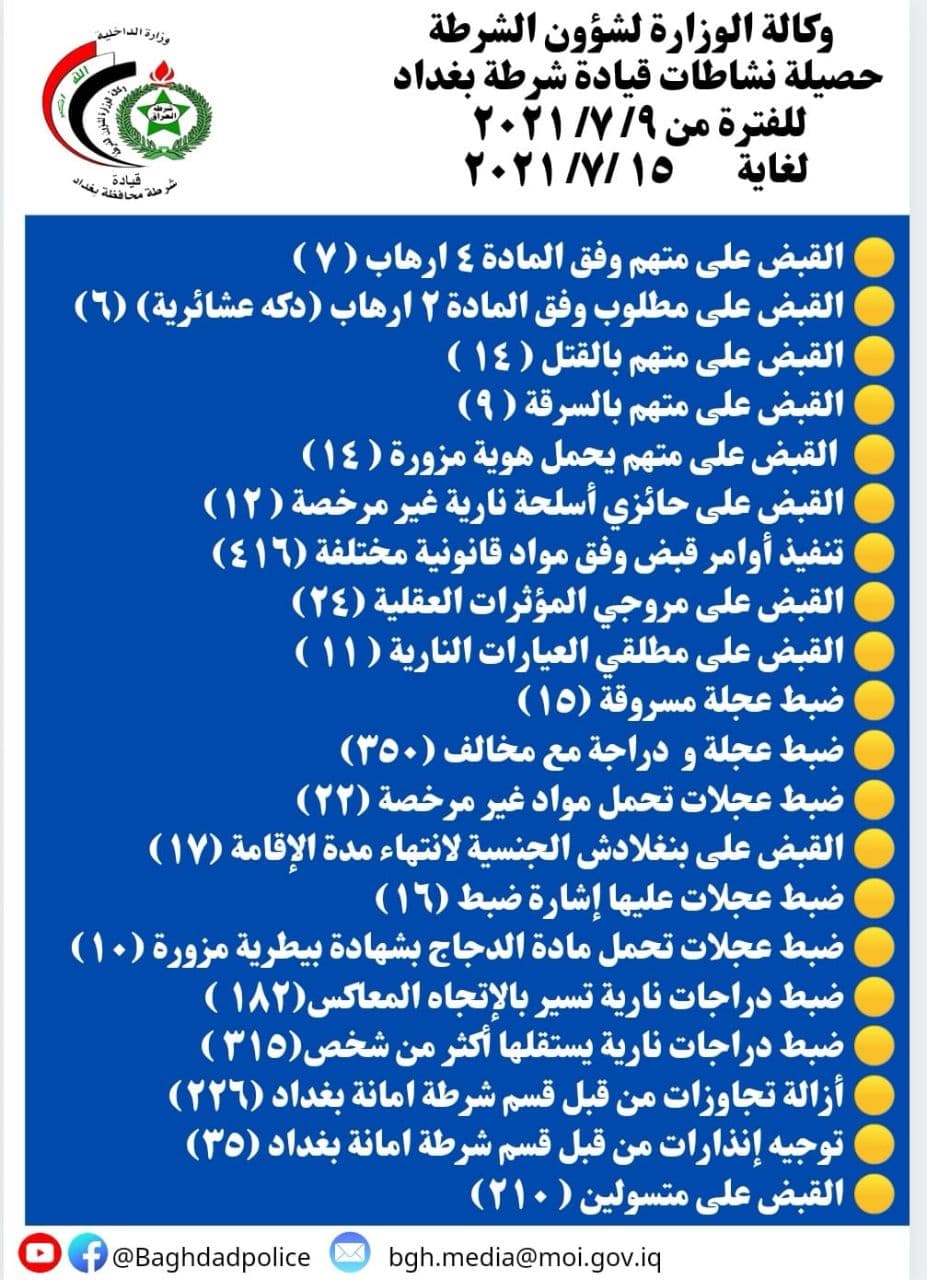 ، اليوم الجمعة، عن حصيلة نشاطاتها للفترة من ٩/ ٧/ ٢٠٢١ لغاية ١٥ /٧/ ٢٠٢١ .