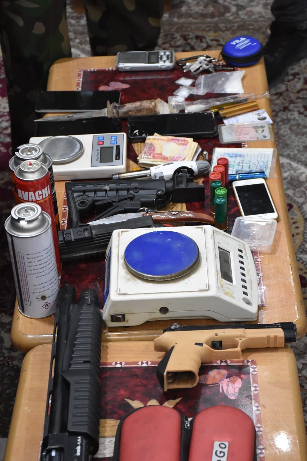 والمؤثرات العقلية حيث تم مداهمة الدار التي في داخلها أفراد العصابة وضبطهم بالجرم المشهود وضبط بحوزتهم ادوات تعاطي وانبولات ومواد مخدرة واسلحة نارية وآلات جارحة وميزان إلكتروني وحبوب مخدرة".