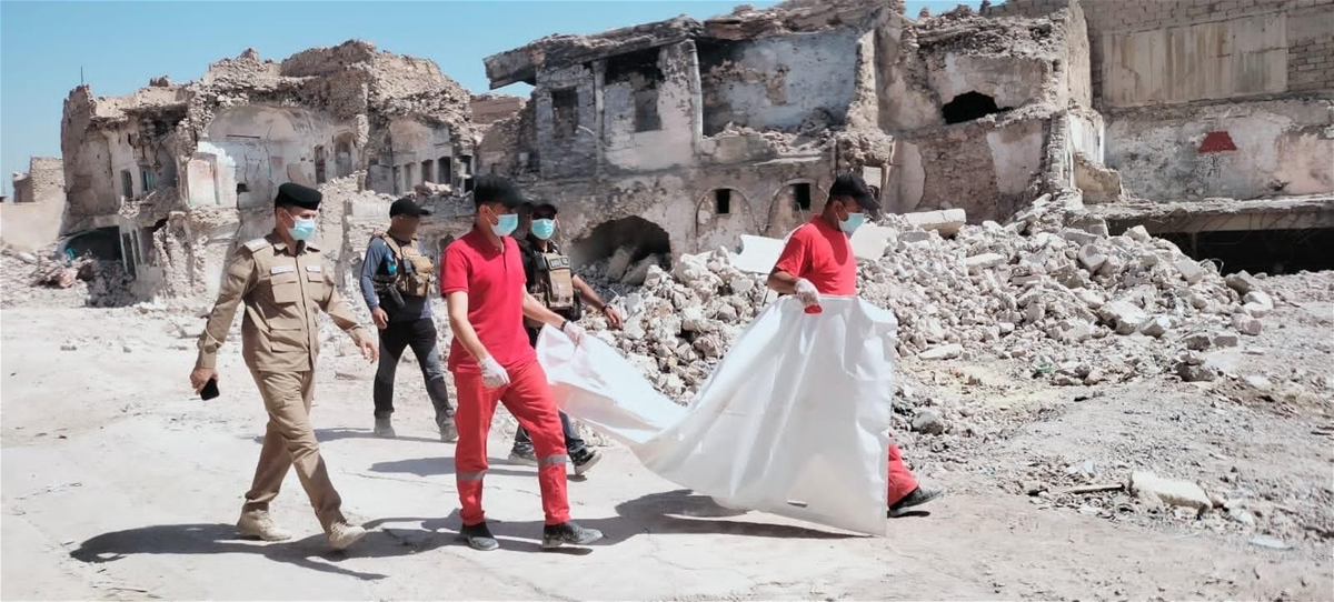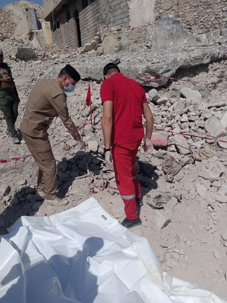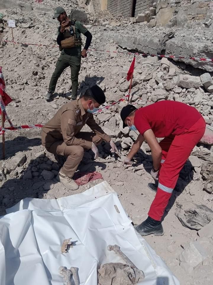 تنتشل (7) جثث عبارة عن بقايا عظمية مجهولة الهوية كانت تحت ركام احد المنازل في منطقة الميدان وسوق النجارين بمدينة