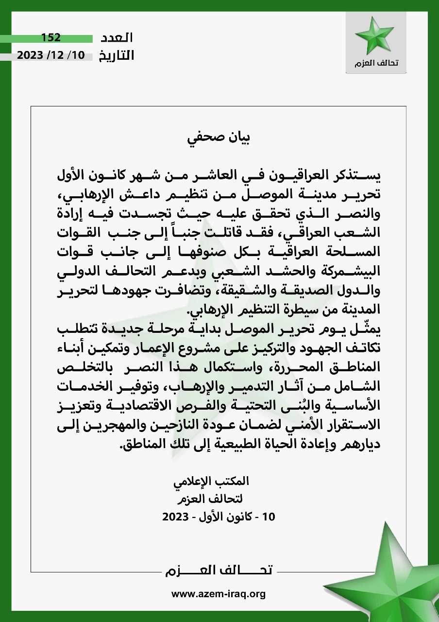 : "يستذكر العراقيون في العاشر من شهر كانون الأول تحرير مدينة