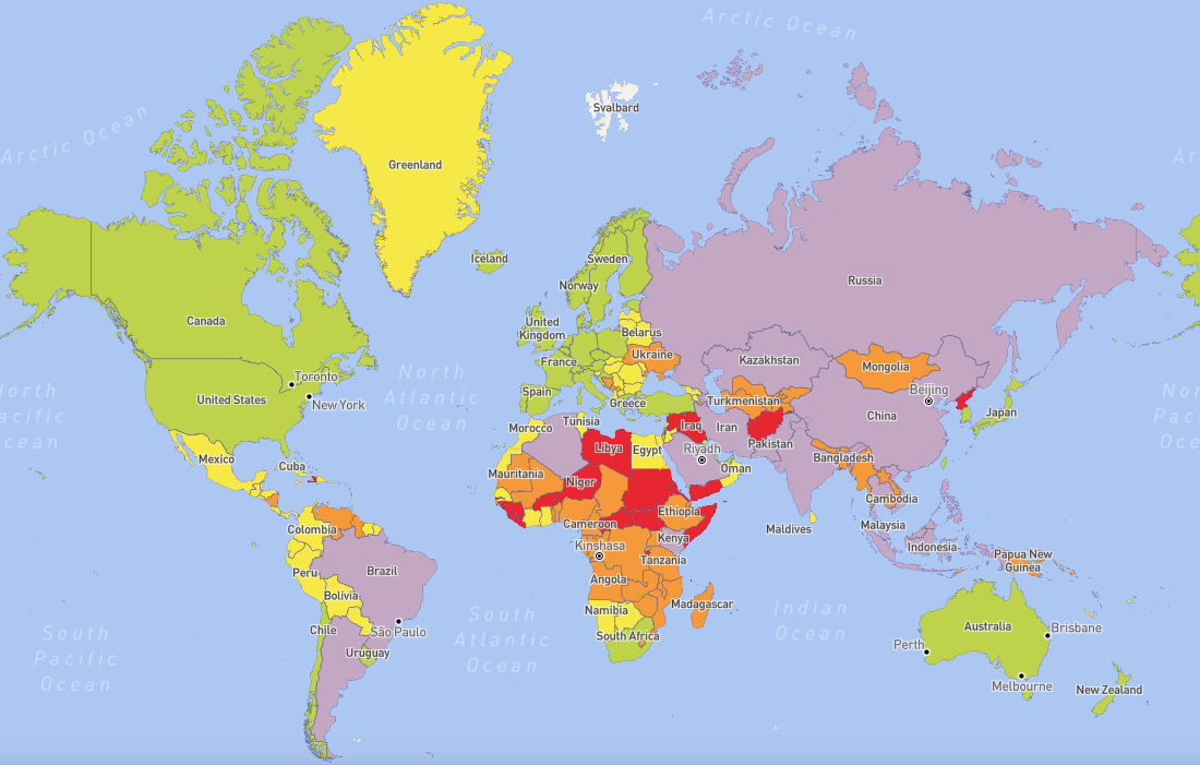 بالمقابل جاءت معظم مناطق أوروبا وامريكا الشمالية وأستراليا بالنطاق الأخضر الامن، وجاء