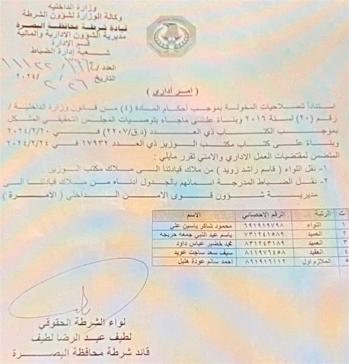 نقل عدد من الضباط في شرطة البصرة (وثيقة)