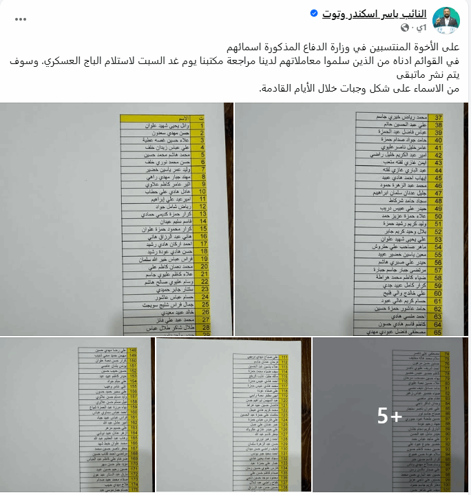 المذكورة اسمائهم في القوائم ادناه من الذين سلموا معاملاتهم لدينا مراجعة مكتبنا يوم غد السبت لاستلام الباج العسكري، وسوف يتم نشر ماتبقى من الاسماء على شكل وجبات خلال الأيام القادمة".