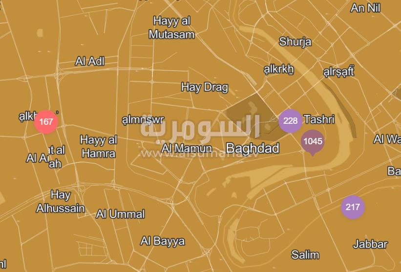 ، حيث ترصد أجهزة تلوث الهواء هناك مستويات عالية جدًا بلغت 1045 درجة، بينما تبلغ 167 درجة فقط غرب بغداد، و174 درجة فقط في مناطق