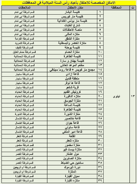 ، اليوم الثلاثاء، الأماكن المخصصة للاحتفالات باعياد رأس السنة، حيث تصدرت