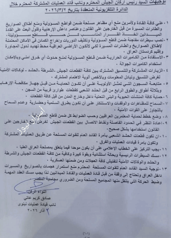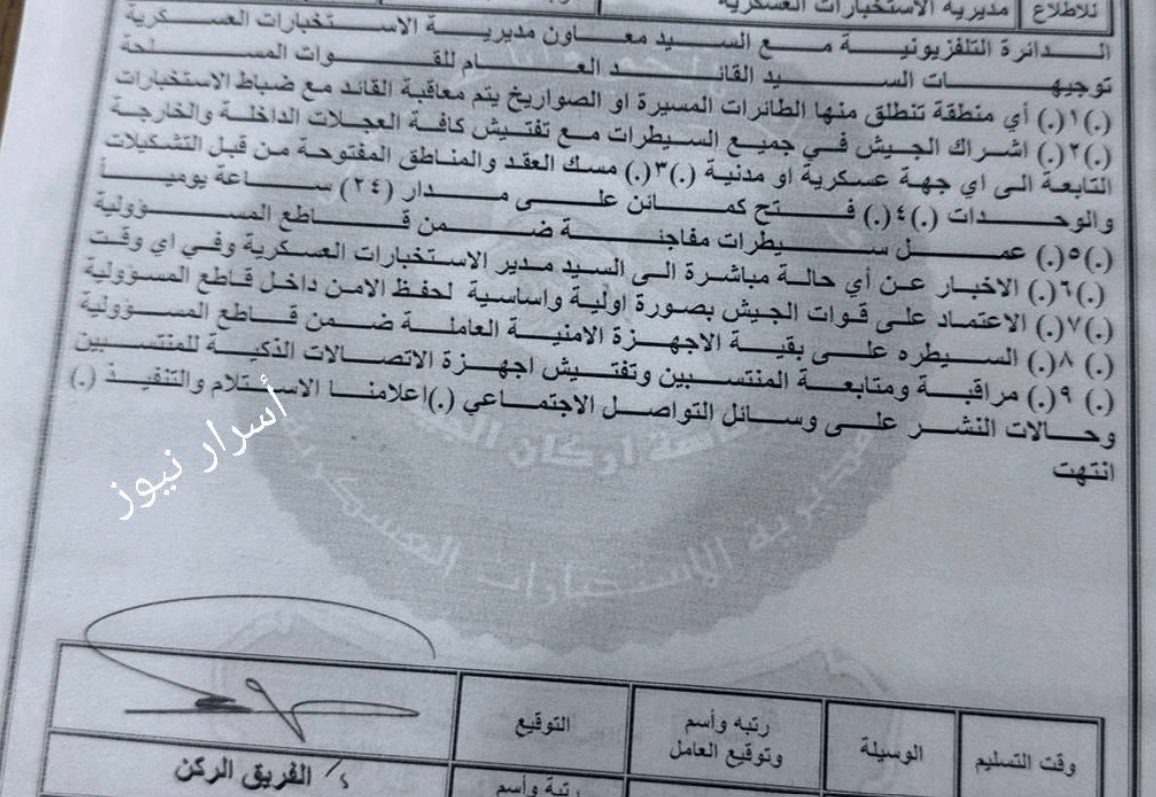 وتضمنت التوجيهات ايضا اشراك الجيش في جميع السيطرات، وتفتيش اي عجلات داخلة او خارجة سواء عسكرية او مدنية، وفتح كمائن على مدار 24 ساعة، وعمل سيطرات مفاجئة، وتفتيش أجهزة الاتصالات الذكية للمنتسبين، ومراقبة حالات النشر على مواقع التواصل.