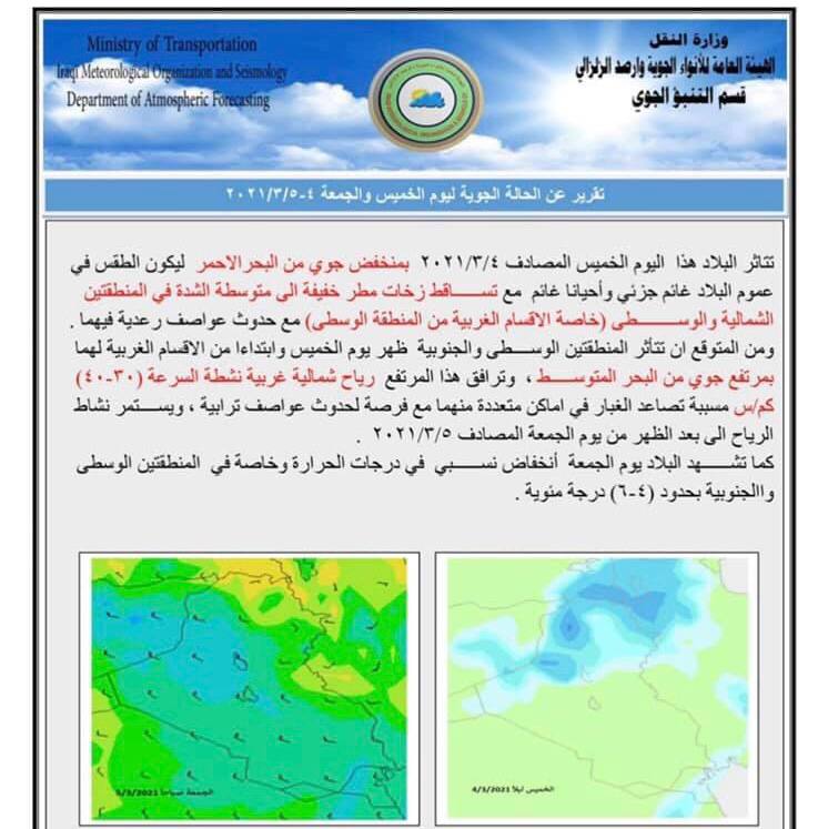 أصدرت الهيأة العامة للأنواء الجوية والرصد الزلزالي التابعة لوزارة النقل، اليوم الخميس، تقريراً جوياً خاصاً بتأثر البلاد بالحالة الجوية ليومي الخميس والجمعة.