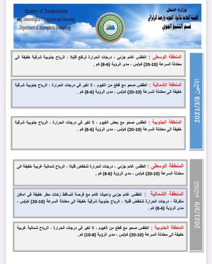وتوقعت الهيئة ان يكون طقس يومي الاثنين والثلاثاء من الاسبوع الجاري، غائما جزئيا في المنطقتين الوسطى والشمالية مع انخفاض قليل بدرجات الحرارة، فيما سيكون صحوا في