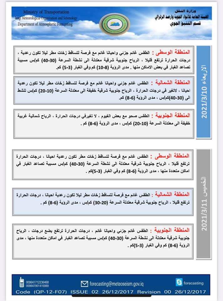 وأشارت الهيئة في توقعاتها ان يكون طقس يومي الاربعاء والخميس غائما جزئيا وغائما مع فرصة لتساقط امطار في المنطقتين الوسطى والشمالية تكون رعدية احيانا مع رياح جنوبية شرقية معتدلة السرعة فيما ستشهد درجات الحرارة ارتفاع قليل بمعدلاتها العامة.