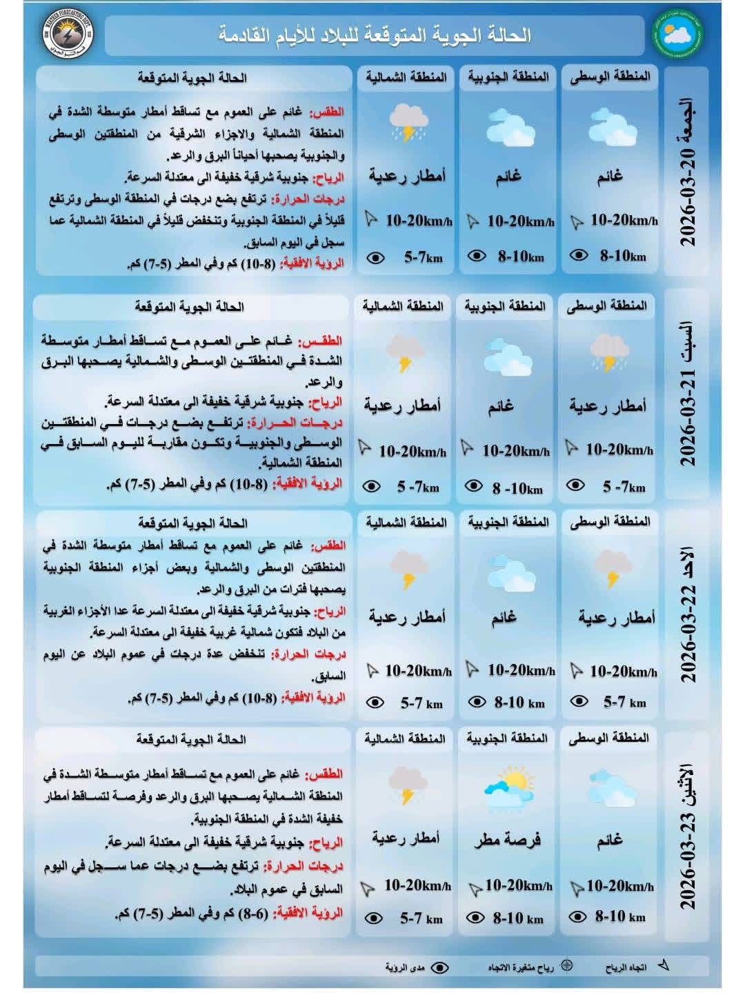 وأضاف، أن "الحالة الجوية المتوقعة ليوم السبت القادم سيكون الطقس غائماً على العموم مع تساقط أمطار متوسطة الشدة في المنطقتين الوسطى والشمالية يصحبها البرق والرعد، ودرجات الحرارة ترتفع بضع درجات في المنطقتين الوسطى والجنوبية وتكون مقاربة لليوم السابق في المنطقة الشمالية، الرؤية الأفقية (10-8) كم وفي المطر (7-5) كم".